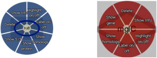 Node context menu. Both gene (blue) and protein (red) nodes offer a context menu.