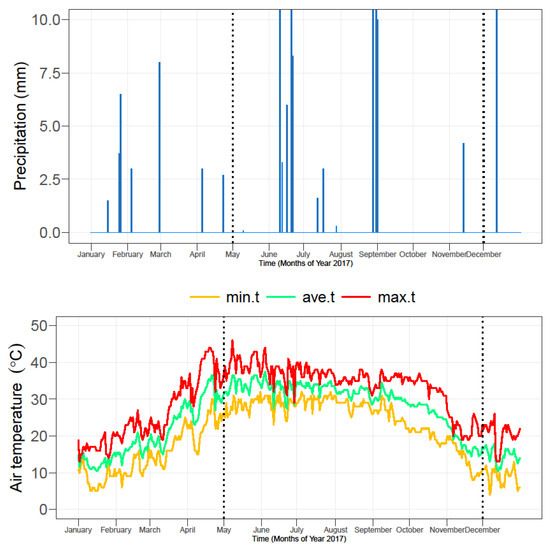 The average minimum, maximum and mean air temperature and rainfall in Multan, Pakistan during 2017. The dotted lines show the duration of experiment.