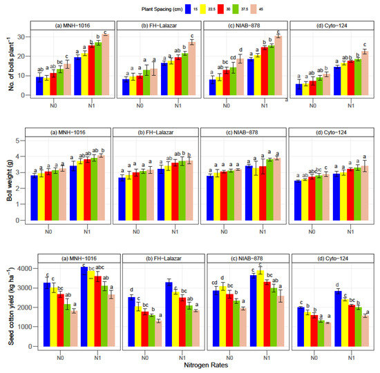 Impact of spacing on the seed cotton yield, boll weight, and no. of bolls plant−1 of four cotton cultivars under different nitrogen applications; No (no nitrogen application) and N1 (nitrogen application 197 kg ha−1). The same letter (s) within variety and nitrogen rate are statistically nonsignificant. Error bar represents the standard deviation (n = 3). Different letters are showing significant difference at p ≤ 0.05.