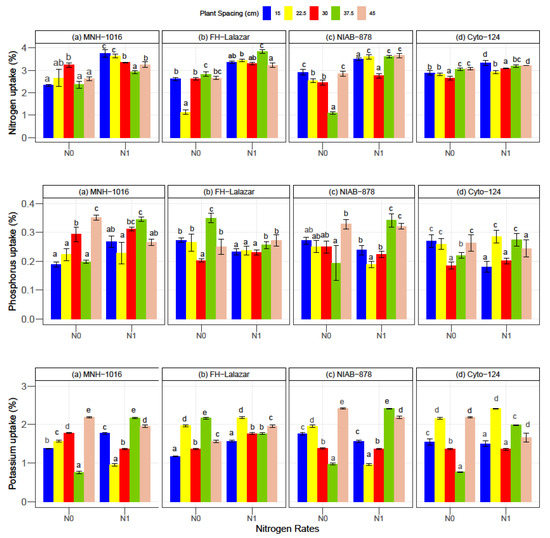 Impact of spacing on the potassium, phosphorus, and nitrogen uptakes of four cotton cultivars under different nitrogen applications; No (no nitrogen application) and N1 (nitrogen application 197 kg ha−1). The same letter (s) within variety and nitrogen rate are statistically nonsignificant. Errors bar represent standard deviation (n = 3). Different letters are showing significant difference at p ≤ 0.05.