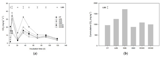 Accordingly, the cumulative CO2 released at the end of the 17 weeks (Figure 1b) showed a statistically significant effect of the treatments (F = 81; p < 0.0001). SDE released the most cumulative CO2 and it was statistically different from all other treatments. The second highest emissions were recorded for the LDE, and this was also statistically different from the remaining treatments. The OCMC was not statistically different from OCMD, yet it was found to be statistically different from both the control and the DED. Lastly, both digestates OCMD and DED, though statistically different in their respective cumulative emissions, did not differ from the cumulative CO2 released by the unamended controls (CT).