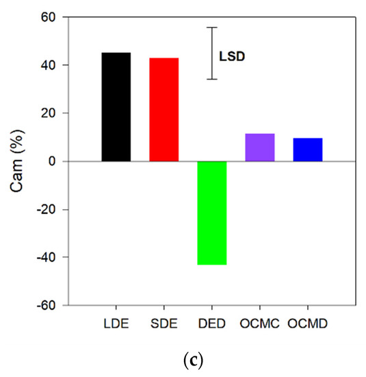 These results are consistent with the results from the ANOVA on the apparent mineralizable C (Cam) available from the amendments, which showed a statistically significant effect of treatments (F = 21; p < 0.0001) (Figure 1c). Three groups were distinguishable regarding Cam; while there was a negative measure for DED (−43%), Cam was the highest for LDE and SDE treatments, whereas a much lower yet positive Cam was available with OCMC and OCMD.