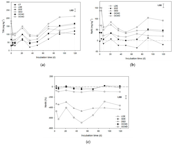 (a) Total inorganic nitrogen (TIN, mg kg−1) calculated as the sum of nitrate plus ammonium (NO3 + NH4) for untreated controls (CT) and soils incubated with LDE, liquid fraction of dairy effluent; SDE: solid fraction of dairy effluent; DED: dairy effluent digestate; OCMC: onion−cattle manure compost; OCMD: onion−cattle manure digestate, over a 119−day incubation period; (b) net available N (NaN, in mg kg−1) calculated as the difference between TIN in each treatment and the CT at each sampling time; (c) net mineralizable N (NmN, %) calculated as the proportion of the organic N added that is available for mineralization at each sampling time. In all panels, the LSD bar represents the least significant difference value (alpha = 0.05) to facilitate visual comparisons among treatment means.