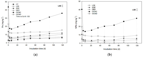 (a) Extractable P (Pe, mg kg−1) measured in untreated controls (CT) or soils incubated with LDE, liquid fraction of dairy effluent; SDE: solid fraction of dairy effluent; DED: dairy effluent digestate; OCMC: onion–cattle manure compost; OCMD: onion–cattle manure digestate, over the 119-day incubation period; (b) net extractable P (mg kg−1) calculated as the difference between Pe in each of the amendments and the Pe in the untreated CT, at each sampling day, during the 119-day incubation period. In all panels, the LSD bar represents the least significant difference value (alpha = 0.05) used to facilitate the visual comparison among treatment means.