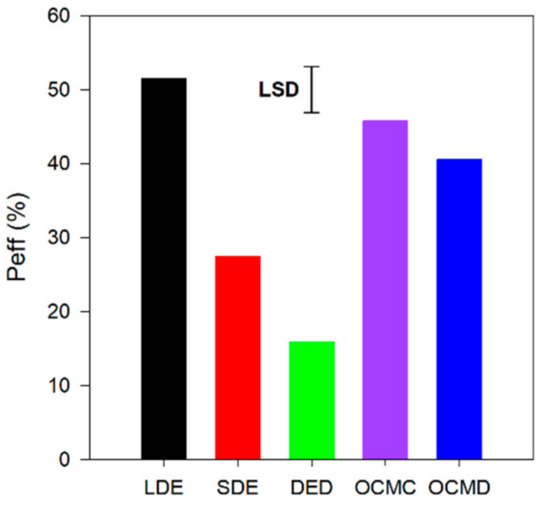 The results from the ANOVA on the efficiency of supplying available P (%Peff) from the amendments show the statistically significant effect of the treatments (F = 43.6; p < 0.0001) (Figure 4, Table S5). Two groups were distinguishable regarding %Peff: three treatments had values higher than 40%, while two treatments showed considerably lower values (<30%). The highest %Peff was obtained with LDE (51%), and was significantly higher than %Peff for OCMD, although it was not different from OCMC. The latter amendment, in turn, did not differ from OCMD. The lowest %Peff was obtained with DED (15%); moreover, DED and SDE treatments were significantly different between themselves and from the rest of the treatments as well.