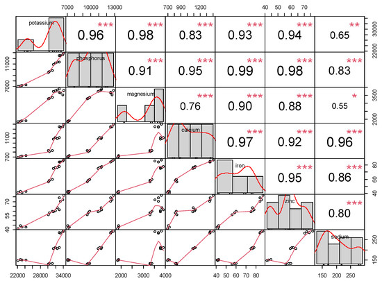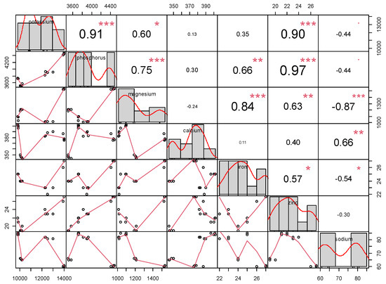 Correlation matrix of macro- and microelement concentrations (mg kg−1 dry matter). Note: *** (p < 0.001), ** (p < 0.01), * (p < 0.05).