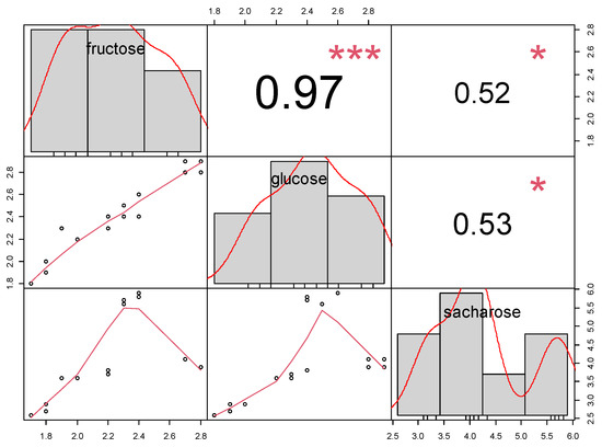 Correlation matrix of sugar concentration (mg kg−1 dry matter). Note: *** (p < 0.001), * (p < 0.05).
