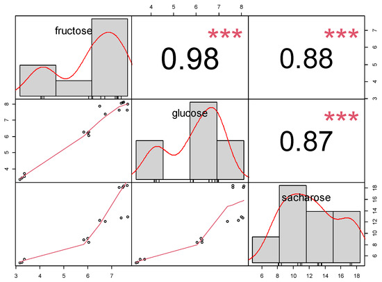 By analysing the values expressed in mg kg−1, it was found that the bivariate linear correlation coefficient for fructose and glucose is very high. The other two coefficients show a moderately strong correlation. All coefficients are significant. The lower triangle matrix shows the nature of the correlation between the variables. The positive linear correlation between fructose and glucose is strong. However, the relationship between fructose and sucrose and between glucose and sucrose suggests a parabolic correlation. For this reason, the linear correlation coefficients are low (Figure 3).