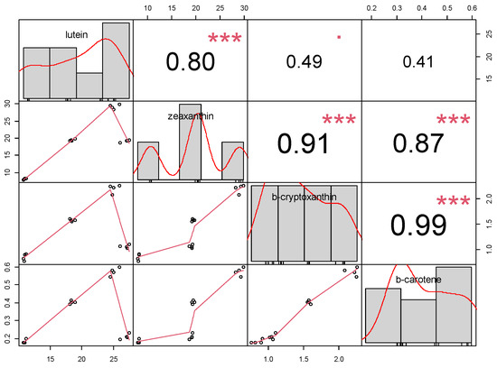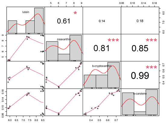 Correlation matrix of lutein, zeaxanthin, β-cryptoxanthin, β-carothene concentrations (mg kg−1 dry matter). Note: *** (p < 0.001), * (p < 0.05).
