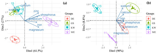 The PCA results for element concentration and element yield were analysed. In the case of element concentration, two principal components are sufficient to describe the correlation system to almost 90%, which is well above the expected 80%. As a conclusion, the two-component model is very adequate. The first principal component consists of potassium, phosphorus, magnesium, iron, zinc, and the second of calcium and sodium (Figure 7a).