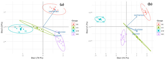 The PCA results for sugars are shown in Figure 8. Figure 8a shows the system of correlations in terms of concentrations.