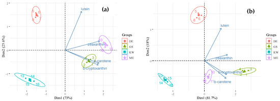 The PCA results for lutein, zeaxanthin, β-cryptoxanthin, β-carothene are shown in Figure 9. Figure 9a shows the system of correlations in terms of concentrations.