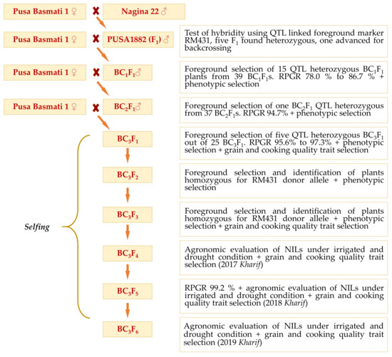 Breeding scheme used in the marker-assisted backcross program for the transfer of qDTY1.1 quantitative trait locus (QTL) in the background of the elite rice variety, Pusa Basmati 1. Recurrent parent genome recovery (RPGR) denotes recurrent parent genome recovery.
