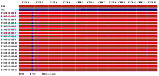 Graphical representation of the genotypes of 18 qDTY1.1 introgressed NILs of PB1. All the NILs had maximum recovery on the carrier chromosome 1. CHR: Chromosome.