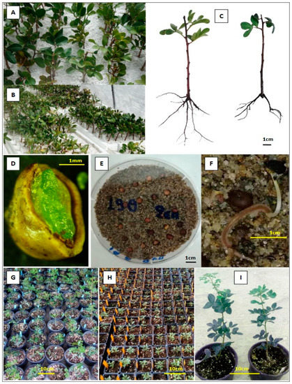 Figure 1. Shoot cuttings of P. lentiscus var. Chia planted for rooting in perlite (A), shoot cuttings in 9 L volume plastic boxes in the fog system (B), rooted shoot cuttings with the application of 4 g·L−1K-IBA (on the left) and without K-IBA (on the right), respectively (C), seed incision of P. lentiscus var. Chia with a healthy embryo (green) (D), Petri dish 9 cm containing sterilized sand and 25 seeds of genotype 19F (Ε), germinated seed (genotype 2F) of P. lentiscus var. Chia, two weeks after seed sowing (F), plantlets derived from rooted shoot cuttings, two months after transplanting into 1.5 L pots (G), young seedlings, three months after seed germination (H), P. lentiscus var. Chia plantlets produced from rooted shoot cuttings six months after transplantation (I).