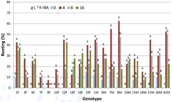 Figure 2. Effect of different concentrations of K-IBA on rooting (%) of shoot cuttings of ten male and ten female genotypes of P. lentiscus var. Chia in winter. Different letters in each genotype indicate statistically significant differences among the concentrations of K-IBA tested according to Duncan’s multiple range test at p ≤ 0.05.
