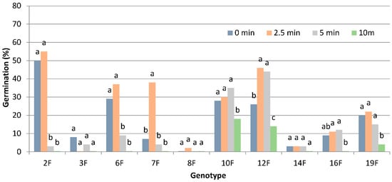 Figure 4. Effect of scarification using H2SO4, at different time-durations (2.5, 5 or 10 min), on seed germination of ten genotypes of P. lentiscus var. Chia, three weeks from the sowing day. Different letters in each genotype indicate statistically significant differences according to Duncan’s multiple range test at p ≤ 0.05.
