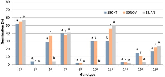 Figure 5. Effect of different time-periods of seed harvesting (15 October, 30 November or 15 January) on germination of ten female genotypes of P. lentiscus var. Chia, three weeks from the day of sowing. Different letters in each genotype indicate statistically significant differences according to Duncan’s multiple range test at p ≤ 0.05.