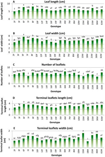 Figure 6. Mean values for 5 out of 13 morphological traits of ornamental interest [leaf length (cm), leaf width (cm), number of leaflets, terminal leaflets length (cm) and terminal leaflets width (cm)] measured on the 20 selected genotypes of P. lentiscus var. Chia. The means of the remaining 8 traits are presented in the Supplementary Table S5. Different letters in columns for each of the traits indicate statistically significant differences according to Duncan’s multiple range test at p ≤ 0.05.