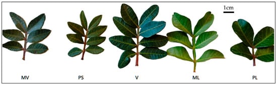 Figure 7. Composite leaves of the five cultivars ‘Mavroschinos’ (MV), ‘Psilophyllos’ (PS), ‘Votomos’ (V), ‘Maroulitis’ (ML) and ‘Platiphyllos’ (PL) of P. lentiscus var. Chia.