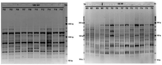 Figure 8. Representative gel electrophoretic pattern of the amplification reactions performed using DNA from P. lentiscus var. Chia genotypes (F2 to F19 and M18 to F19) and primers UBC 841 and UBC 808. Τhe size of the amplified zones was calculated using 1kb DNA ladder plus.