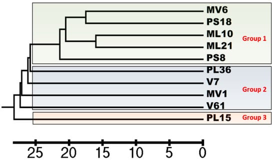 The data from the ISSR molecular markers analysis of the ten males of P. lentiscus var. Chia genotypes were also used separately to determine the genetic distance among them. These data were recorded in a dendrogram to determine whether our results of the genetic analysis were in agreement with the results of the phenotypic measurements that identify the cultivars of P. lentiscus var. Chia [‘Mavroschinos’ (MV), ‘Psilophyllos’ (PS), ‘Maroulitis’ (ML), ‘Platiphyllos’ (PL) and ‘Votomos’ (V)]. To this end, the names of genotypes were converted from 1M, 6M, 7M, 8M, 10M, 15M, 18M, 21M, 36M and 61M, to MV1, MV6, V7, PS8, ML10, PL15, PS18, ML21, PL36 and V61, respectively, in order to facilitate their presentation in the figure. The results of the dendrogram (Figure 11) separated the genotypes into three different groups. Groups 1 and 2 include genotypes belonging to different morphological cultivars: Group 1 contains genotypes belonging to ‘Mavroschinos’, ‘Psilophyllos’ and ‘Maroulitis’, while group 2 includes members of ‘Platiphyllos’, ‘Votomos’ and ‘Mavroschinos’. Group 3 consists of a single plant belonging to the cultivar ‘Platiphyllos’. These findings establish the existence of genetic heterogeneity in most morphological cultivars and are in partial agreement with the results of Zografou et al. [19], who used RAPD and ISSR analysis on 11 plants (ten male and one female) and reported that the cultivars were separated genetically, but the members of the cultivars were not genetically homogeneous. In order to better understand the genetic classification of P. lentiscus var. Chia, more genotypes should be examined, and more markers should be applied so that a safe conclusion can be drawn from the analysis of the data.