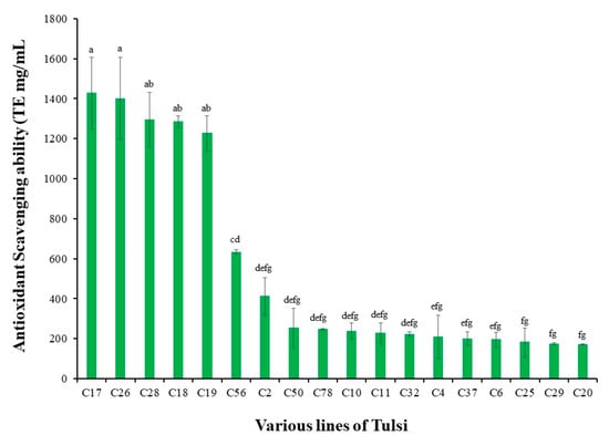 Average antioxidant scavenging activity of 18 lines of Tulsi compared to a Trolox equivalent (µmol TE/g) standard using 2,2-diphenyl-1-picrylhydrazyl (DPPH) antioxidant assay. Names on the x-axis represents an individual line from different seed lots. Vertical bar with same letters indicates no significant difference between treatments at (p > 0.05). Data are displayed as mean, with bars representing standard error.