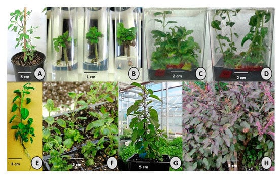 - Jamal, M.A.H.M.; Sharif, I.H.; Shakil, M.M.; Rahman, A.N.M.R.-B.; Banu, N.A.; Islam, M.R.; Nazmuzzaman, M. In vitro regeneration of a common medicinal plant, Ocimum sanctum L. for mass propagation. Afr. J. Biotechnol. 2016, 15, 1269–1275. [Google Scholar] [CrossRef][Green Version]