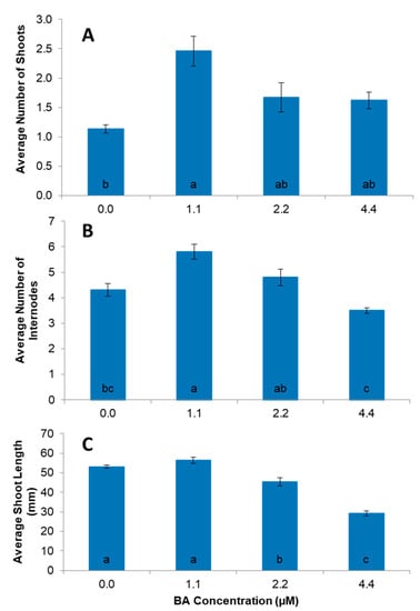 The effect of various concentrations of BA added to Murashige and Skoog basal (MS) medium on average number of shoots (A), number of internodes (B) and shoot length (C) of ‘Vrinda’ nodal explants after 4 weeks of culture. Data represent mean ± standard error from about 36 explants per treatment and three replications. Means from all the treatments were compared with each other using Tukey’s test. Vertical bar with same letters indicates no significant difference between treatments at (p > 0.05).