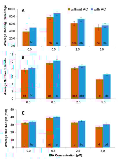 Shoots from nodal cultures developed roots when induced with IBA (0.5–5.0 µM) in the presence and absence of activated charcoal. Overall, the MS medium containing IBA at 0.5 µM in combination with 0.6% activated charcoal was found to be the most effective to stimulate the development of a healthy root system compared to the control (Figure 4A and Figure 2E). The highest number of roots (10.3), root length (40.2 mm), and percentage of rooting (88.9%) were obtained on medium supplemented with 0.5 µM IBA with and without 0.6% activated charcoal (Figure 4A–C and Figure 2D,E). The addition of activated charcoal had positive effects on the rooting percentage, numbers of root, and root length when compared to medium without activated charcoal. These values were all significantly greater than the control with and without activated charcoal. The average number of roots on shoots cultured with 2.5 µM IBA was not significantly different than the control and 5.0 µM IBA was significantly less effective than the control (Figure 4B).