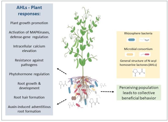 Plant responses to N-acyl homoserine lactones (AHLs) produced by plant-growth-promoting bacteria in the rhizosphere. Single members of a bacterial consortium could interact/communicate to perceive certain population densities and respond as a collective to induce several plant-beneficial activities, such as stimulation of root hair formation, root growth and development, and general plant growth and self-defense mechanisms.