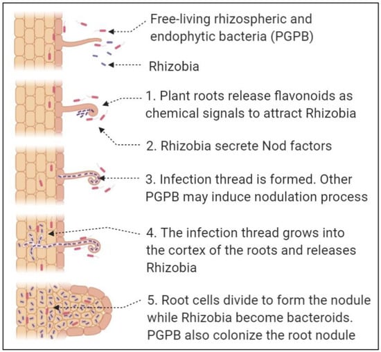 The formation of N-fixing nodules induced by rhizobia. Free-living plant-growth-promoting rhizobacteria and bacterial endophytes may induce the nodulation process and increase the nitrogen fixation, general plant growth, and nutrimental state.