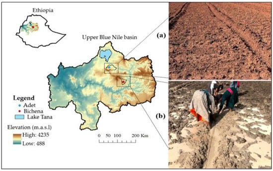 Map of the study areas and pictures (a) and (b) showing the field conditions and land preparation at the two locations, Adet and Bichena, during teff planting time.