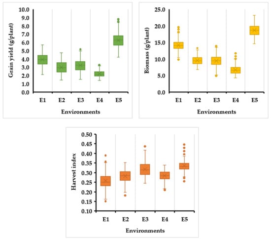 Genotype performance across the test environments for grain yield, biomass, and harvest index based on BLUP-adjusted mean values. E1 = Adet 2018, E2 = Adet 2019, E3 = Bichena 2018, and E4 = Bichena 2019. E5 refers the intensive growing condition and the data were analyzed separately.
