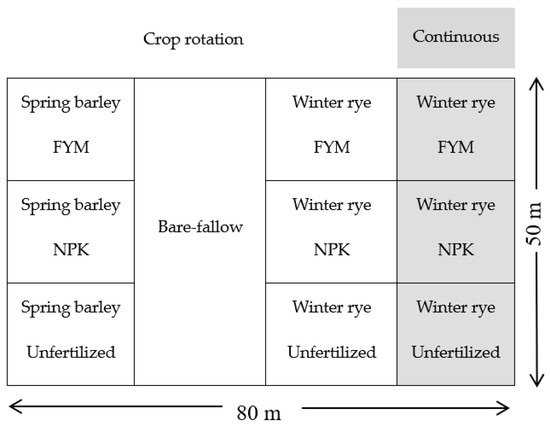 The long-term field experiment was started to test the possibility of replacing FYM by easily soluble NPK, and whether different fertilization systems can compensate for crop rotation deficits from continuous cropping of winter rye [1]. Data on the experiment before the 1960s, however, are rare or missing. Therefore, the yield data from 1960 to 2019 were used for this study. The field trial comprises an area of 4000 m2, which is divided into four long plots of 1000 m2, each with three equal sub-plots (20 m × 13 m) used for the different fertilization levels, and split into two parts for either monoculture or crop rotation (Figure 1).