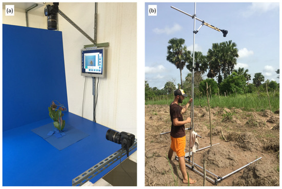 (a) Indoor imaging station with two cameras used for yam imaging at ETH Zurich plant research station in Eschikon and (b) the field-imaging platform with one camera in nadir view as moved over the field by the imaging operator in Côte d’Ivoire.