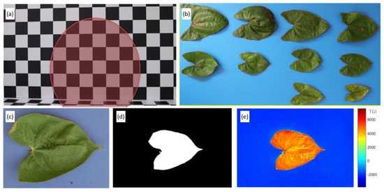 (a) Checkerboard for distortion correction; (b) leaves spread out on the blue plate; (c) single leaf; (d) segmented leaf; and (e) single leaf triangular greenness index, TGI. Red dots on leaves (b) indicate saturated pixels or necrotic tissue not identified as green and excluded from the spectral index analysis.