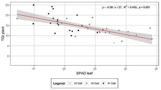 Relationship between the SPAD value measured on the 7th fully developed leaf starting from the apex of the main vine and the plant TGI value averaged for all leaves at 20, 40 and 61 days after emergence, DaE) in a greenhouse experiment conducted with water yam cv raja ala grown in the presence of different N fertilizations. Each dot represents the value for one plant (n = 42 plants). The form of the symbols indicates the sampling dates, and the grey band indicates the 95% confidence interval.