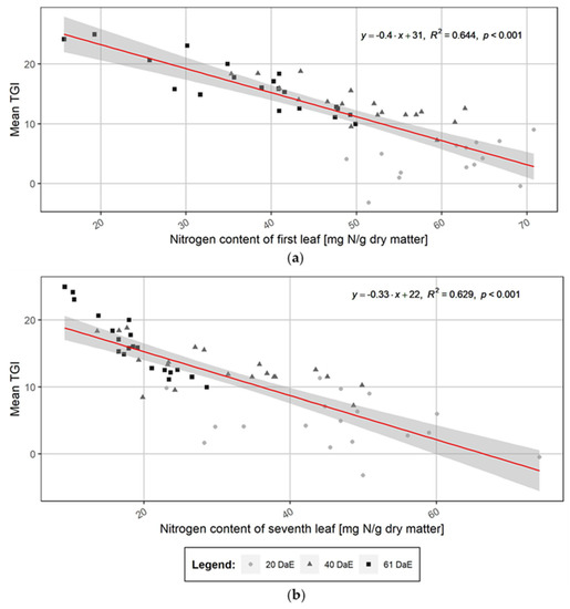 The SPAD values measured on 14 July and 8 and 10 August 2018 on diagnostic leaves was negatively correlated to the TGI values measured at plant level (Figure 9; Table S6), whereas no relation was observed between TGI and leaf N content, or SPAD and leaf N content measured on 8 and 10 August 2018.