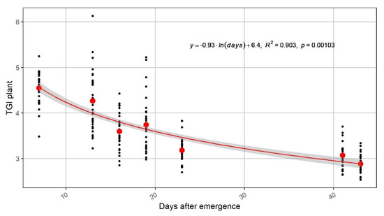 A significant nonlinear relation was observed between the average TGI values calculated for each sampling day and the number of days after germination (Figure 8).