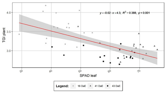 Relationship between the SPAD value measured on diagnostic leaves with an RGB camera and TGI of plants measured by imaging and time on 14 July, 8 and 10 August (after 16, 41 and 43 days after emergence, DaE) in a field experiment conducted with water yam (cv C18) in Tieningboué (Côte d’Ivoire) with different fertilizations and rotations. Each dot represents the average values for one plot or two plants. The grey band indicates the 95% confidence interval.