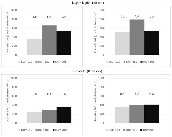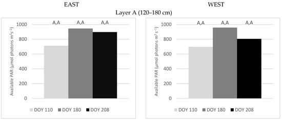 Available PAR (μmol photons m2 s−1) in relation to layer (layers A, B and C) on east and west sides of orchard with north-south orientation on three DOYs. The first letter denotes significant differences between layers for a given exposure and DOY (n = 45; p = 0.05/0.01; SNK test); the second letter denotes significant differences between exposure for a given layer and DOY (n = 90; p = 0.05/0.01; SNK test). Lower case letters denote statistical differences with p = 0.05. Capital letters denote statistical differences with p = 0.01.