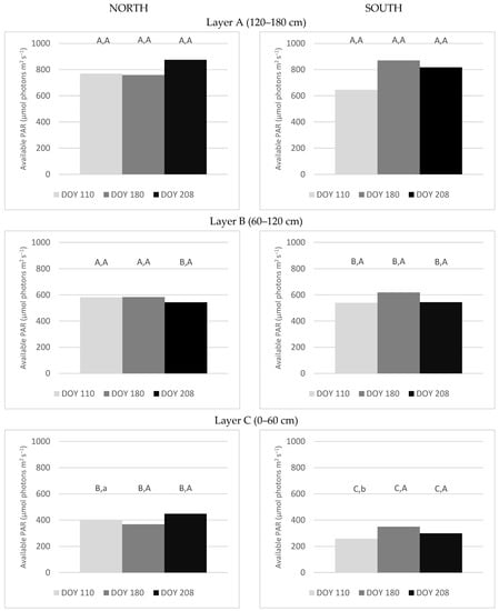 Available PAR (μmol photons m2 s−1) in layers (A, B and C) of orchard with east-west orientation (north and south exposures) on three DOYs. The first letter denotes significant differences between layers for a given exposure and DOY (n = 45; p = 0.05/0.01; SNK test); the second letter denotes significant differences between exposure for a given layer and DOY (n = 90; p = 0.05/0.01; SNK test). Lower case letters denote statistical differences with p = 0.05. Capital letters denote statistical differences with p = 0.01.