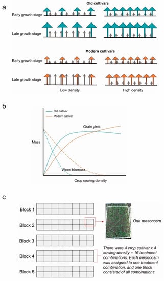 Here, we report on an outdoor mesocosm experiment to test how sowing density influences both weed suppression and population yield of modern and old crop cultivars of spring wheat (Triticum aestivum L.). We selected four wheat cultivars that were released in two different periods in semi-arid areas of Northwest China. We tested the following hypotheses: (1) weed growth is lower at higher crop sowing density, and the old cultivars have a greater ability to suppress weeds than the modern cultivars at low density (Figure 1b); (2) grain yield increases with crop sowing density under high weed pressure, and the new cultivars produce a higher grain yield than old cultivars at high density (Figure 1b).