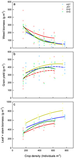 Relationships between crop density and (a) weed biomass, (b) grain yield, and (c) leaf + stem biomass, for two old cultivars Cultivar Heshangtou (HST) and Jinbaoyin (JBY) and two modern cultivars Xihan2 (XH2) and Xihan3 (XH3). Solid lines are the quadratic fits with p < 0.05, and the dashed lines indicate nonsignificant fits (p > 0.05).