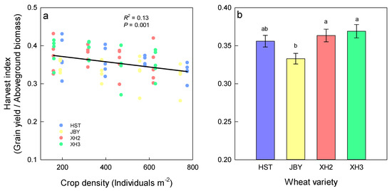 (a) The overall relationship between crop density and harvest index. The solid line is the simple linear fit. (b) The difference in harvest index among the 4 varieties. The old cultivars are Heshangtou (HST) and Jinbaoyin (JBY); the modern cultivars are Xihan2 (XH2) and Xihan3 (XH3). Data with different letters are significantly different (p < 0.05).