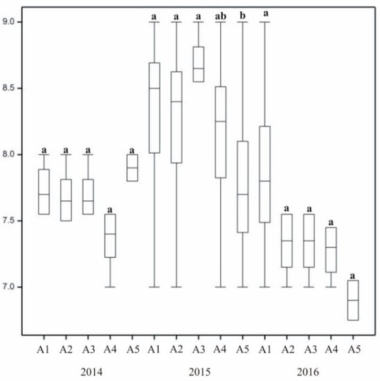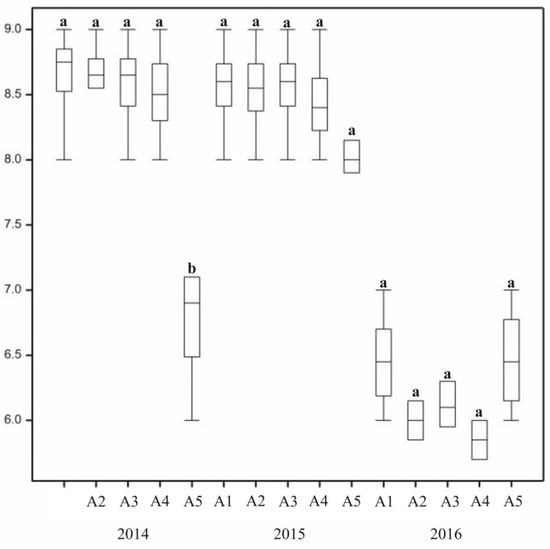 Grass leaf fineness ratings varied across the years of research and annual seasons (Figure 6). The average value of this parameter was at a high level, with grass producing delicate long leaves. Throughout the experiment, leaf fineness was assigned high scores during summer assessment. In 2014, the autumn assessment was more favourable than the spring assessment, while the most favorable value was recorded in the summer. In 2016, all three ratings across three seasons differed statistically. In autumn 2016, leaf fineness ratings reached the lowest level.