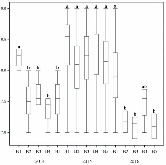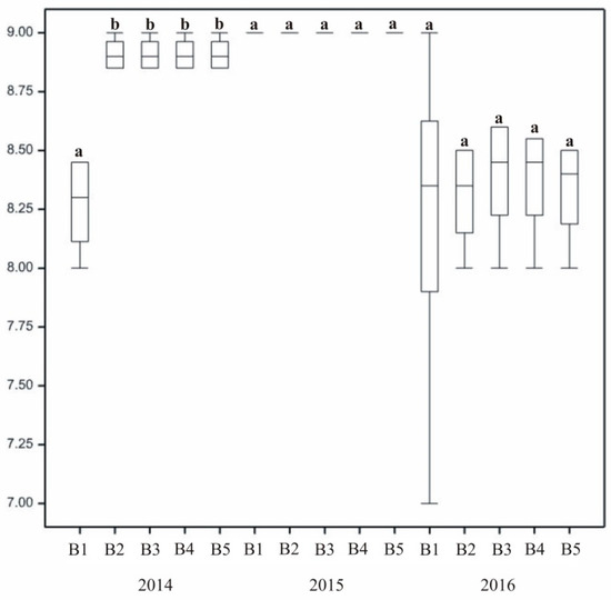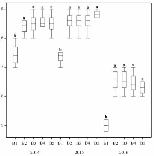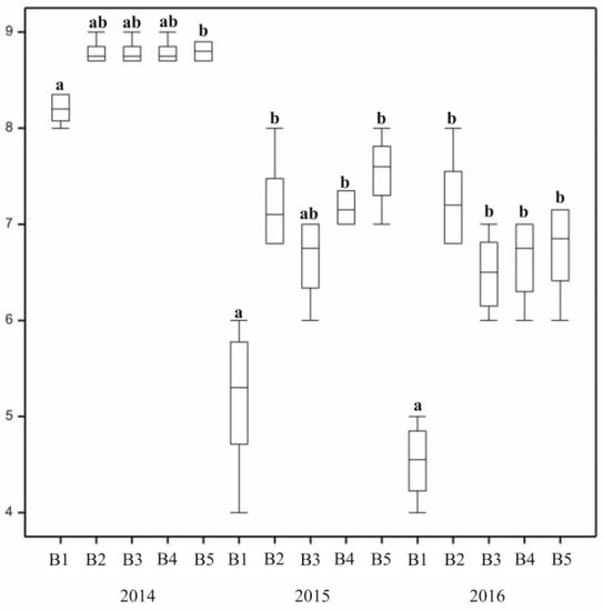 The degree of grass winter survival varied across subsequent years of research. The most favourable value was recorded in 2014, with overwintering assessed as very good (Figure 8 and Figure 9). In 2015 and 2016, the values decreased, with satisfactory or good ratings. Significant differences were recorded between the winter survival of untreated control turf (B1) and lawns where treatment was applied. A low overwintering score of the control lawn (B1) indicated that treatment of plants positively affected their winter survival. Furthermore, statistically significant differences in overwintering ratings between different forms of treatment were recorded. In the second and third years, plots treated with mineral fertilizers were rated 2–3 points higher than control turf. The two other substances applied to grass also had a positive effect on lawn overwintering.