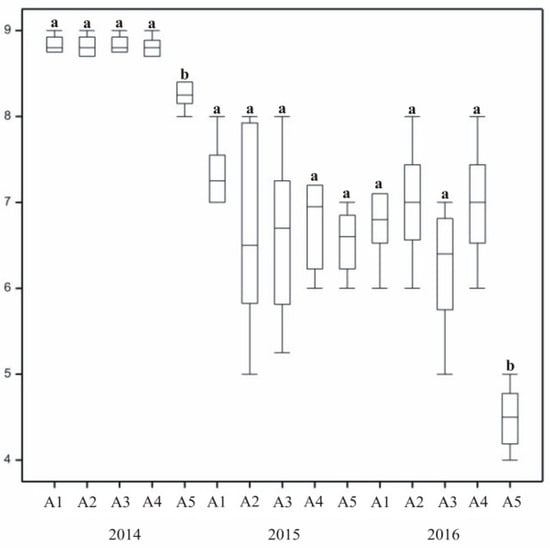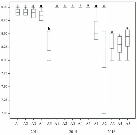 In 2015 and 2016, overwintering ratings of lawns with different varieties of the same species were at a similar level (Figure 8). When interpreting the results presented graphically, slight differences were observed across mixtures. In the third year (2017), the bluegrass mixture (A5) was in a significantly worse condition after winter than the others. Overwintering of the turf was also dependent on its species composition, with the lowest overwintering ratings assigned to single-species mixtures. Statistically significant differences between grass mixtures in their overwintering assessment were recorded in 2015 and 2017.