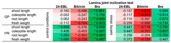 Linear correlation coefficient between lamina joint inclination test and plant growth parameters in control conditions and during salinity stress. The data in red means negative correlation; green, positive correlation. The asterisks indicate significant correlations revealed by analysis of variance, (*) p < 0.05, (**) p < 0.01 (Table S5).